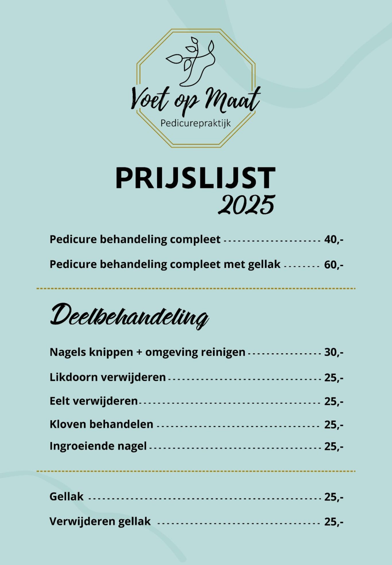 Pedicurepraktijk voor professionele voetverzorging en behandeling van voetproblemen. Ik ben gediplomeerd pedicure en aangesloten bij de brancheorganisatie Pro Voet. In mijn praktijk draait het niet alleen om zorg en kwaliteit, maar ook om plezier en welzijn!